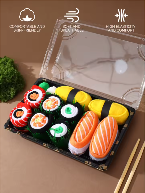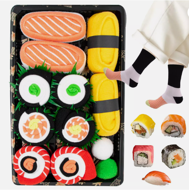 IDEAL FOR A GIFT - fantastic idea for a funny gift that will spark a lot of laughter. Surprise your nearest and dearest with the contents of the box! Whether it's a Christmas gift/birthday gift/Valentine's Day gift, our sushi socks are a universal gift for all . Sushi socks will be also practical as a party gift or corporate gift. We guarantee a burst of laughter when the gift recipient discovers that they received socks instead of sushi. Trick your ?