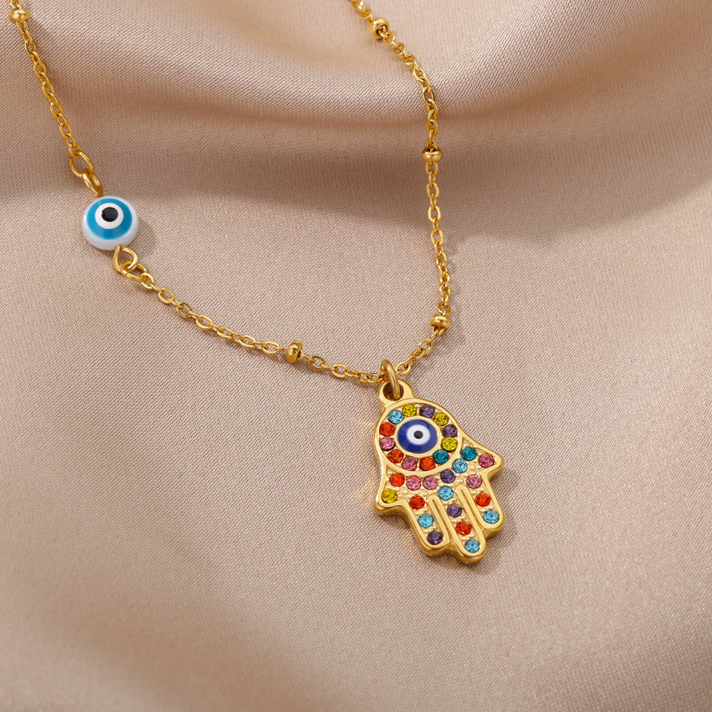 Ward off negative energy with this stunning Evil Eye Hamsa Necklace. Crafted with care, the delicate pendant features a vibrant blue evil eye symbol embedded within the protective Hamsa hand. Made from high-quality materials, this eye-catching necklace adds a touch of mystical charm to any outfit while serving as a talisman for good luck and protection against the evil eye. A must-have accessory for those seeking both style and spiritual significance.