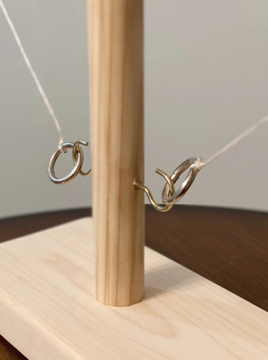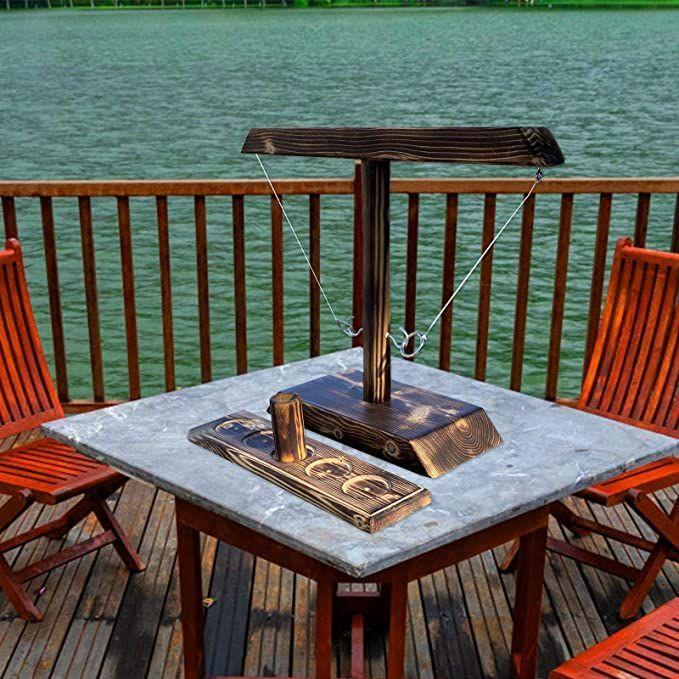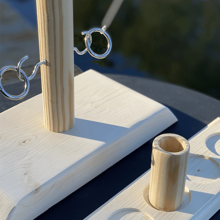 Place wooden cup in the center circle, Take rings and go! Each time you land the hook, move the wooden cup 1 space towards your opponent. Player wins when the wooden cup moves off the end of the ladder. Raise the Stakes - Play every game Style by agreeing on a wager with your competitor before the game!.