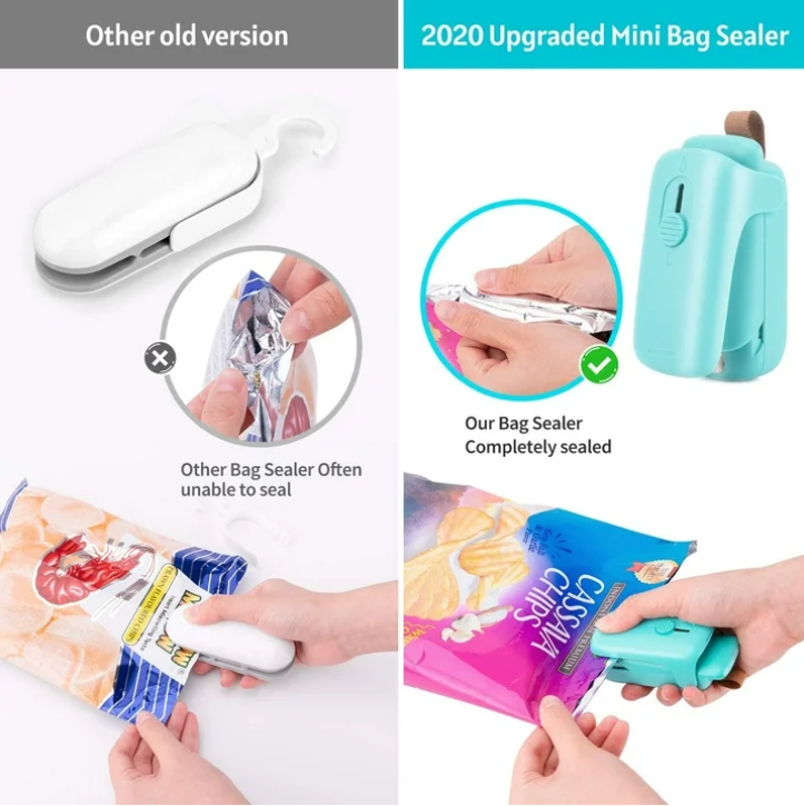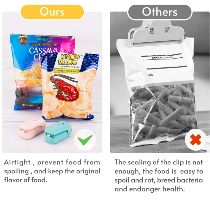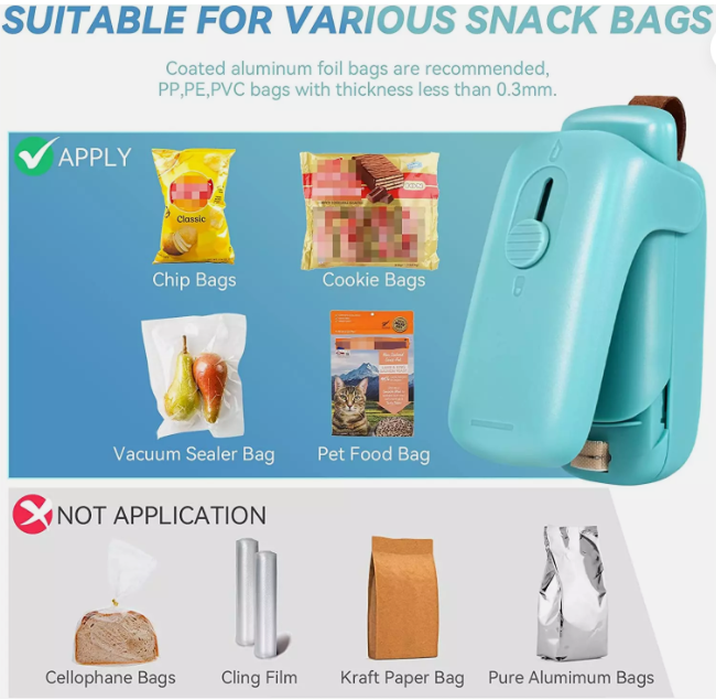 - 【Food Storage & Freshness】- With no need for worrying about containers leaking or opening which lead a mess or food spoilage. Using our mini bag sealer, all your snacks and food are allowed to be soft, dry and kept fresh for days. Appropriated for various bags, Coated aluminum foil bags are recommended PP,PE,PVC bags with thickness no more than 0.3mm. Such as storage bags, potato chip bags, fruit bags, sugar bags and so on.
