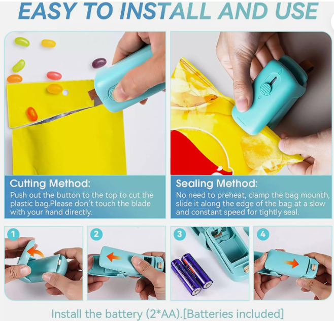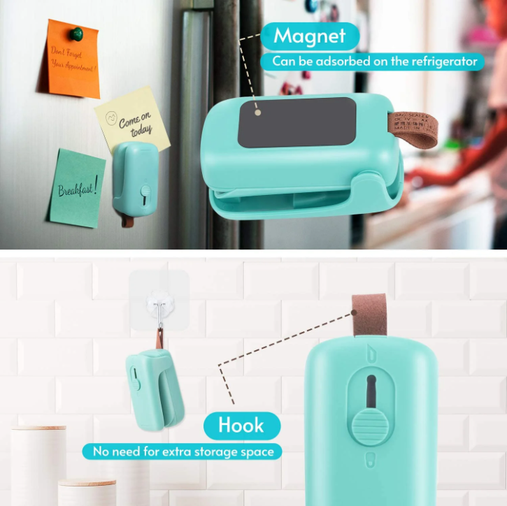 - 【2 in 1 Sealer&Cutter】- Small body contains two functions - one side is used for opening your bag, the other side is used as a bag sealer. The heating element and the slide switch resists high temperature and prevent accidental press. With an unique manget on the bottom and one lanyard in the top, this bag sealer mini makes it convenient to be adsorbed on the refrigerator or hang from any corner when not in use. It is an essential kitchen accessory.